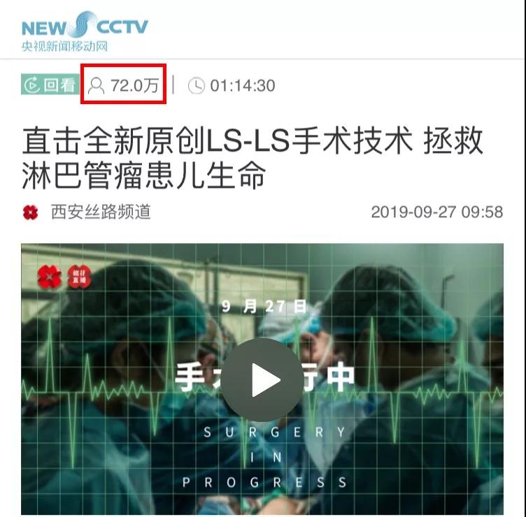 開診后的第一個(gè)手術(shù)日,西安電視臺(tái)全程直播了全新原創(chuàng)LS-LS手術(shù)技術(shù)拯救淋巴管瘤患兒生命的手術(shù)過程!央視新聞移動(dòng)網(wǎng)、今日頭條客戶端、廣東廣播電視臺(tái)觸電新聞、西安網(wǎng)微博等同步播出西安國際醫(yī)學(xué)中心骨科醫(yī)院拯救淋巴管瘤患兒的全過程。據(jù)不完全統(tǒng)計(jì),在線觀看直播達(dá)百萬,僅央視新聞移動(dòng)網(wǎng)的觀看量達(dá)72萬!