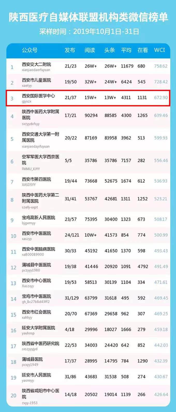 10月榜單數(shù)據(jù):西安國際醫(yī)學(xué)中心微信公眾號總閱讀數(shù)15w 、頭條閱讀數(shù)13w 、平均閱讀數(shù)4311、總在看數(shù)1131、微信傳播指數(shù)WCI672.9。