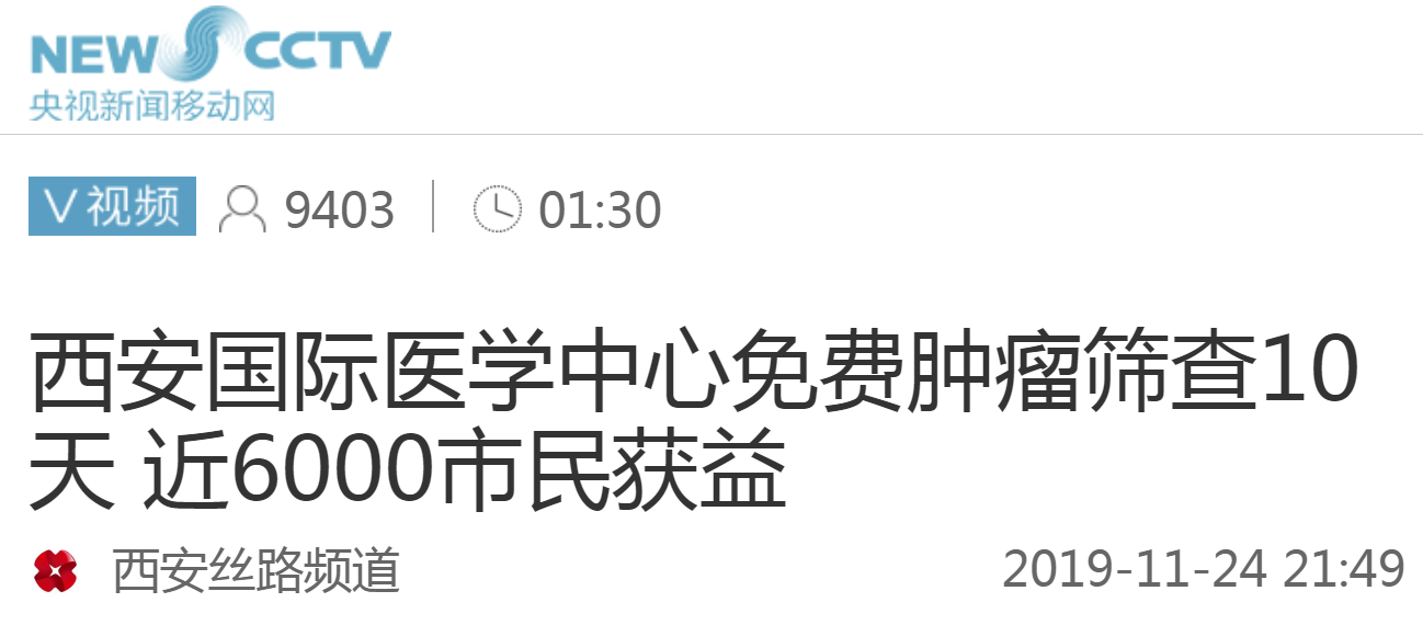 央視新聞移動網(wǎng)報道—西安國際醫(yī)學(xué)中心免費腫瘤篩查10天 近6000市民獲益。點擊閱讀。