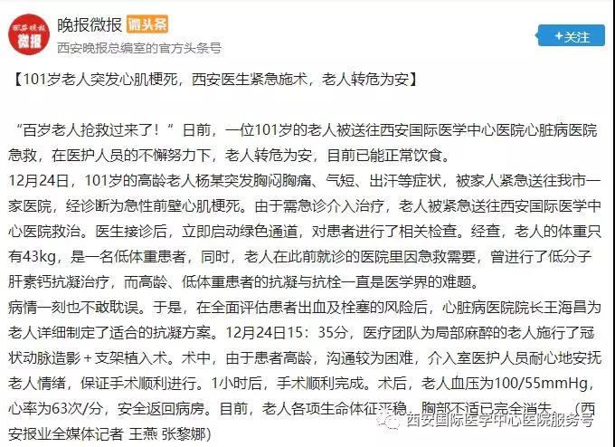 12月24日,心臟病醫(yī)院成功救治了一位101歲的老年患者。心臟病醫(yī)院CCU潘僑主任為患者在局部麻醉下行冠狀動脈造影+支架植入術。目前,患者轉危為安,已能正常飲食。