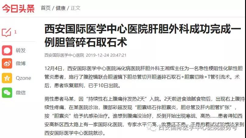 12月4日,西安國際醫(yī)學中心醫(yī)院消化病醫(yī)院肝膽外科王湘輝主任為一名急性梗阻性化膿性膽管炎患者,施行了腹腔鏡聯(lián)合膽道鏡下膽總管切開膽道碎石取石 膽囊切除 T管引流術。術后,患者恢復良好,于10日出院。