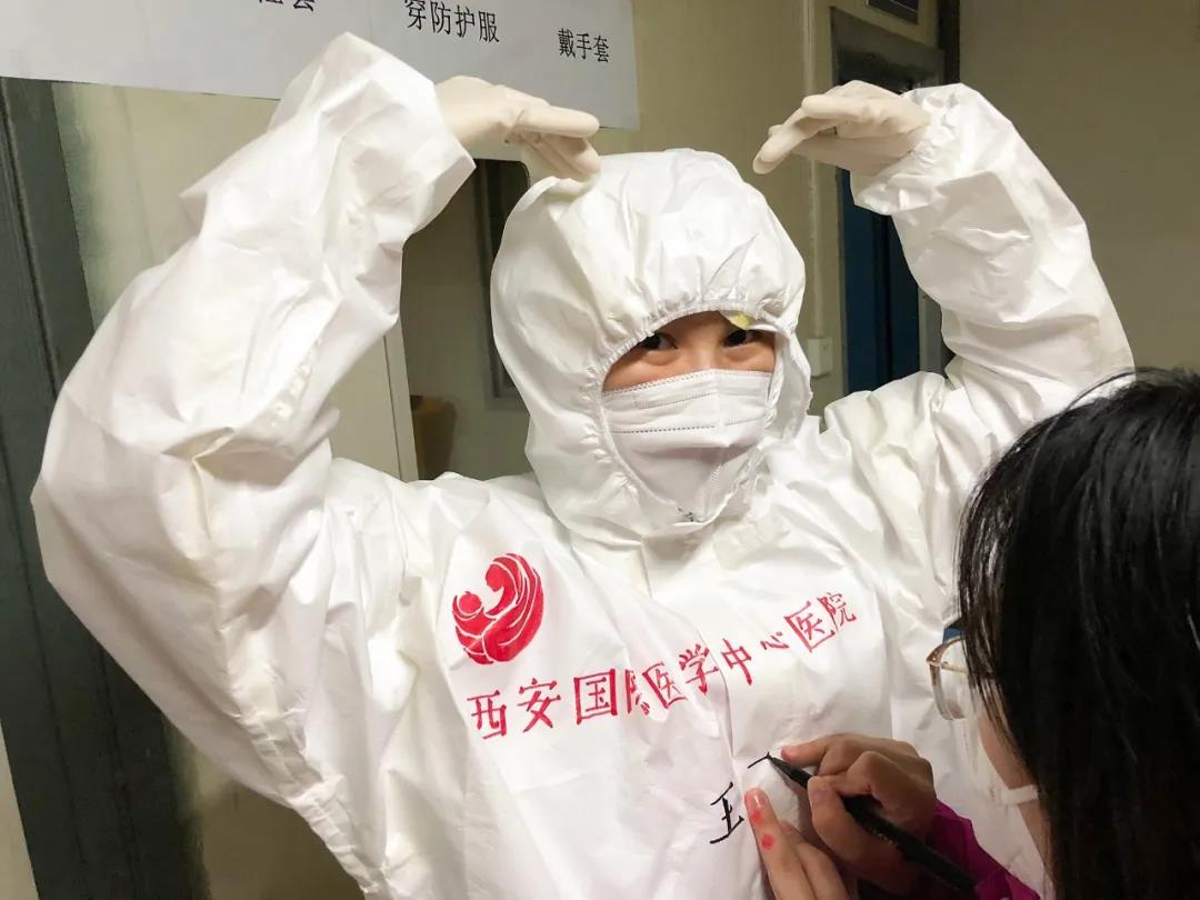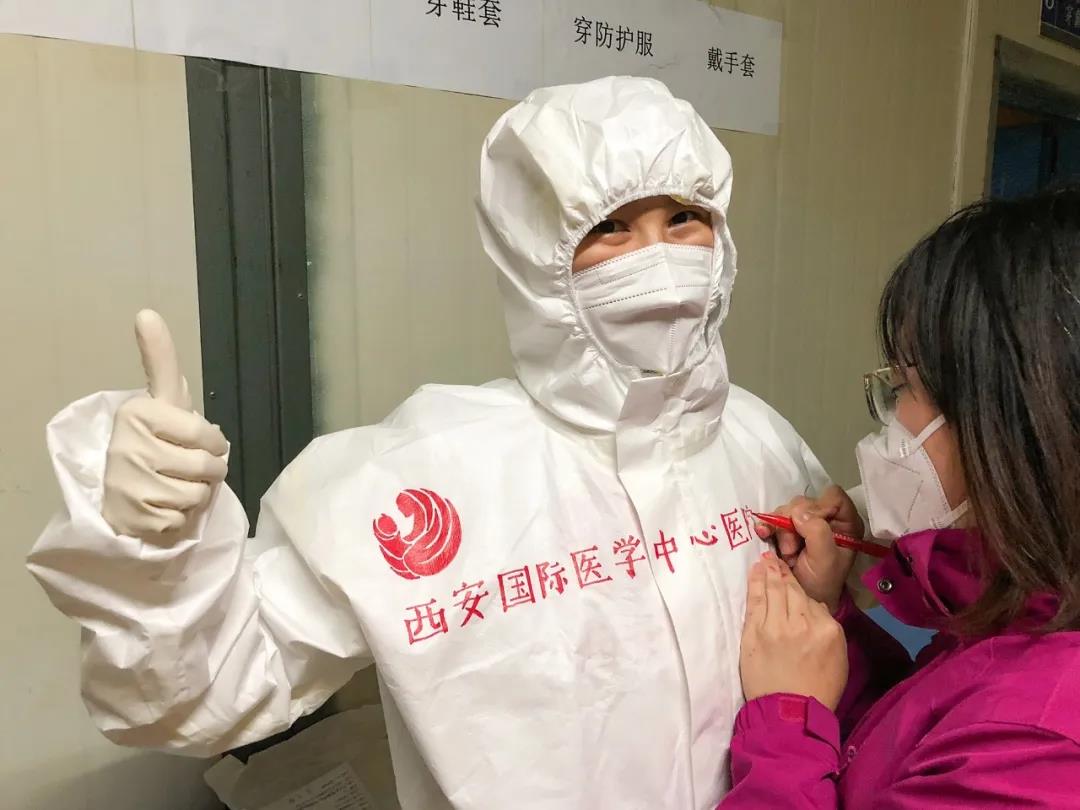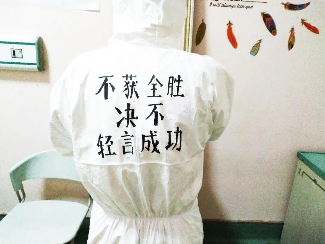 西安國(guó)際醫(yī)學(xué)中心醫(yī)院援鄂醫(yī)療隊(duì)醫(yī)護(hù)隊(duì)員都有一身特別的白袍,手繪版防護(hù)服上有國(guó)際醫(yī)學(xué)的logo。“不獲全勝絕不輕言成功”、“武漢加油”的娟秀字跡提升士氣,醫(yī)護(hù)人員擊敗新冠病毒的漫畫(huà)也鼓舞人心。