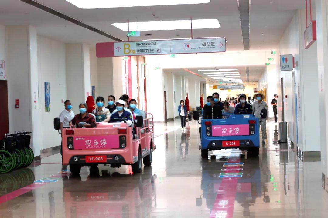 自2019年9月25日開診以來,醫(yī)院在門診一二三層都配備了“招手停”電瓶車,免費(fèi)接送就醫(yī)民眾和醫(yī)護(hù)人員往返于各??漆t(yī)院和科室,隨招隨停。
