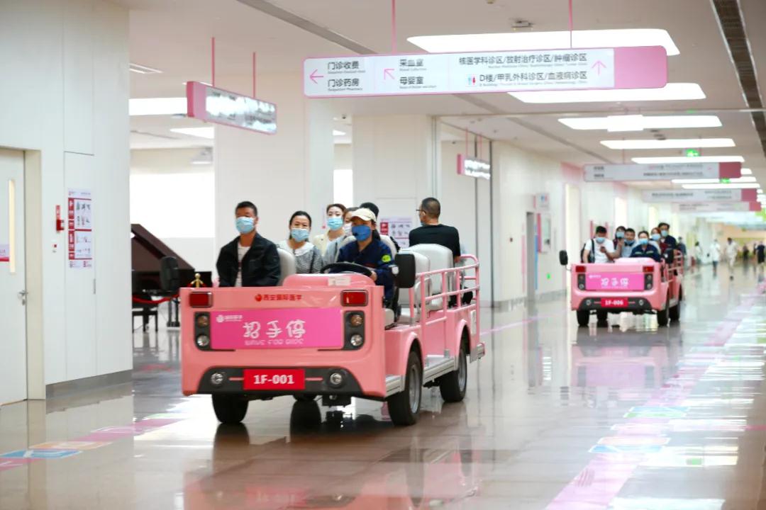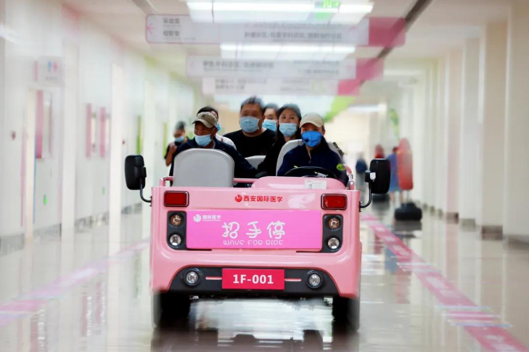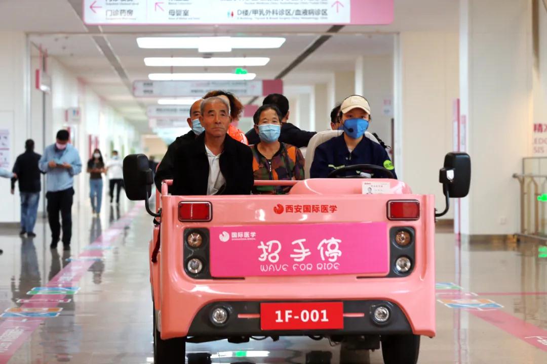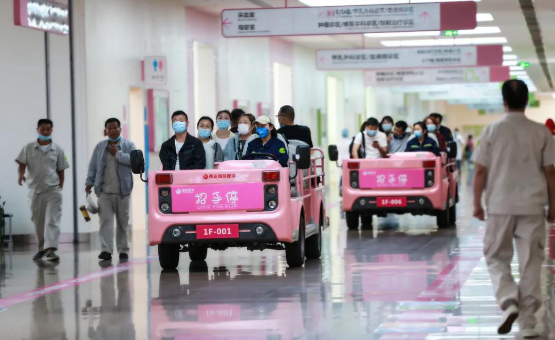 6月8日,在西安國際醫(yī)學(xué)中心醫(yī)院醫(yī)療大樓內(nèi),多輛“招手停”電瓶車正穿梭在走廊里,接送患者和醫(yī)護(hù)人員。