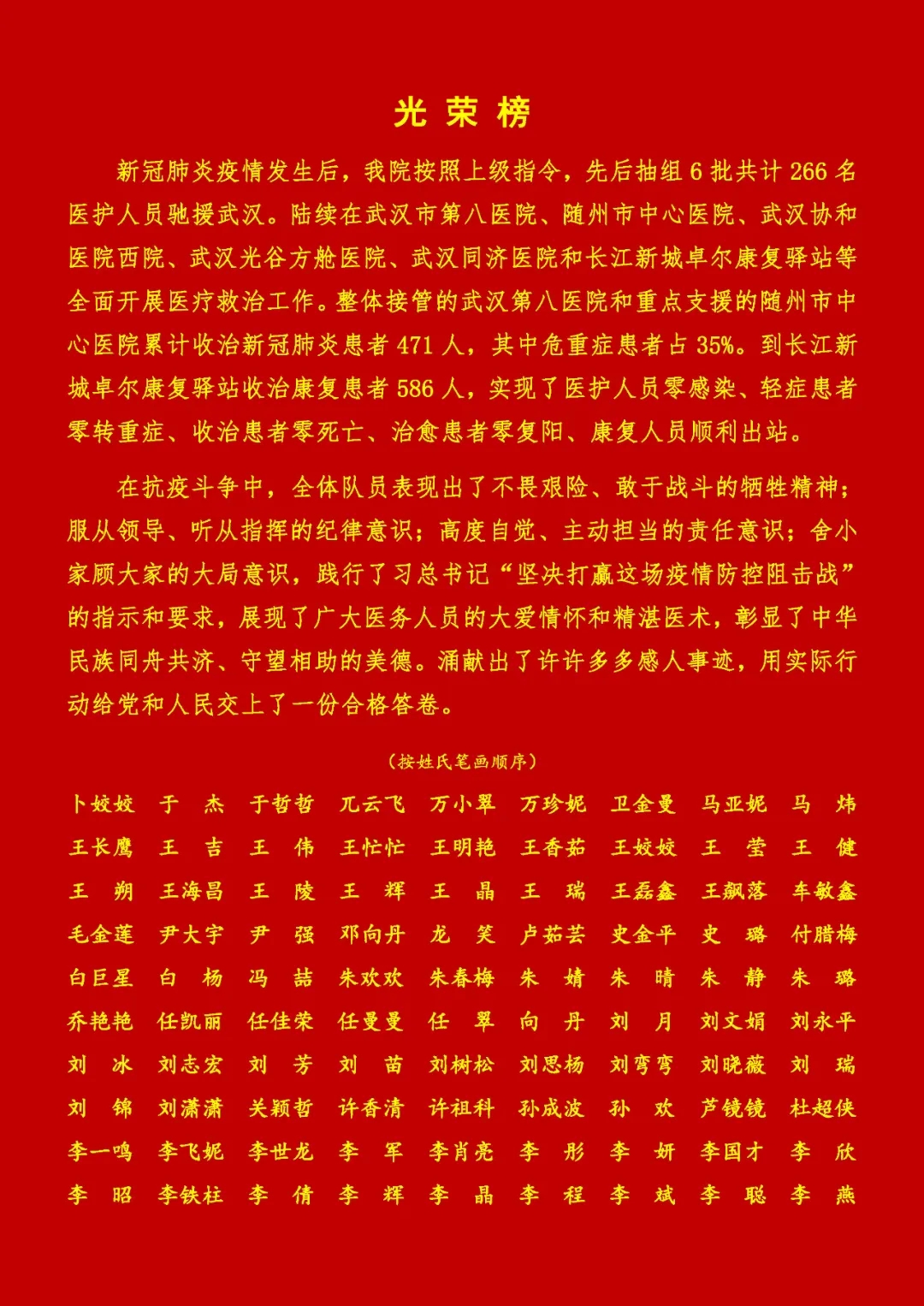 在這場沒有硝煙的戰(zhàn)疫中,醫(yī)療隊(duì)員們不負(fù)重托和希望,克服了重重困難,發(fā)揮專業(yè)優(yōu)勢,與武漢市第八醫(yī)院、隨州市中心醫(yī)院一道,開展新冠肺炎患者救治工作,負(fù)責(zé)的3個(gè)重癥和危重癥病區(qū)、6個(gè)普通病區(qū),累計(jì)收治患者471人,累計(jì)出院423人;負(fù)責(zé)的長江新城康復(fù)驛站現(xiàn)6個(gè)艙累計(jì)收治586人,累計(jì)康復(fù)461人,轉(zhuǎn)出或代管的125人。無重患,無死亡,至此,醫(yī)療隊(duì)全部返回,為陜西人民交上了滿意的答卷。