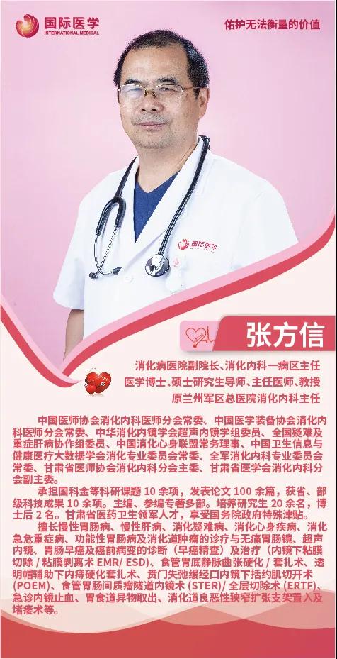 張方信擔任中國醫(yī)師協(xié)會消化內(nèi)科醫(yī)師分會常委,中國醫(yī)學裝備協(xié)會消化內(nèi)科醫(yī)師分會常委,中華消化內(nèi)鏡學會超聲內(nèi)鏡學組委員,中華消化心身聯(lián)盟常委,全國疑難及重癥肝病協(xié)作組委員,全軍消化內(nèi)科專業(yè)委員會常委等職務(wù)。從醫(yī)四十余載,他對慢性胃腸病、慢性肝病、消化疑難病、消化心身疾病、消化急危重癥病與消化道腫瘤具有豐富的診治經(jīng)驗。擅長超聲內(nèi)鏡、胃腸早癌內(nèi)鏡精查及其內(nèi)鏡下微創(chuàng)治療。