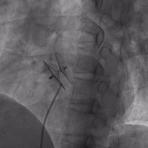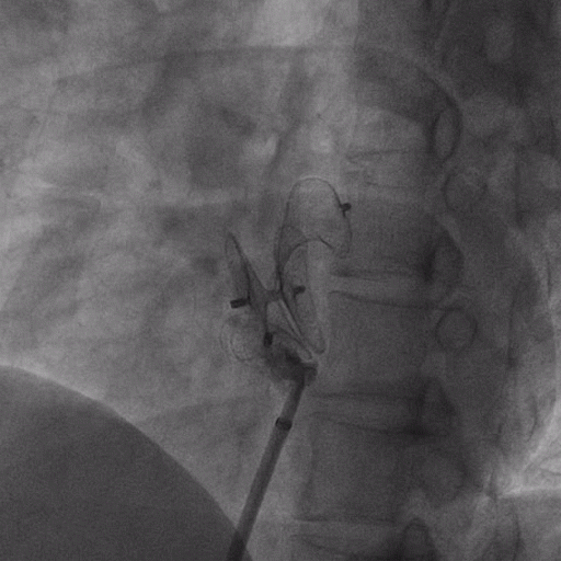 在獲得患者同意后,1月12日,尚福軍主任為患者進(jìn)行了PFO封堵術(shù)。術(shù)中造影可見(jiàn)封堵器殘余漏,尚福軍主任用精湛的技藝,順利通過(guò)封堵器殘余漏裂縫,將右心導(dǎo)管從右房送入左房,且順利到達(dá)肺靜脈;遂行卵圓孔未閉封堵術(shù)后殘余漏再次封堵;且完美釋放PFO封堵器,可見(jiàn)兩封堵器呈“馬蹄蓮”狀,再次術(shù)中造影未見(jiàn)殘余漏。