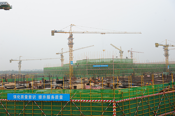 隨后李毅一行在史總帶領(lǐng)下,來到工地現(xiàn)場(chǎng)的二層觀景平臺(tái),面對(duì)規(guī)模宏大,塔吊林立的建筑現(xiàn)場(chǎng),看到項(xiàng)目整體浮出地面,中心醫(yī)技樓已建至二層,李書記對(duì)項(xiàng)目建設(shè)進(jìn)度表示驚喜,同時(shí)對(duì)建設(shè)管理表示肯定。期間,史總結(jié)合施工現(xiàn)場(chǎng)和效果圖為李書記詳細(xì)介紹了國際醫(yī)學(xué)城的建設(shè)架構(gòu),功能劃分等情況,之后還就規(guī)劃建設(shè)的“一心兩翼 天使之城”健康中國小鎮(zhèn)的設(shè)計(jì)理念,“五位一體”功能布局等做了詳細(xì)介紹和說明。