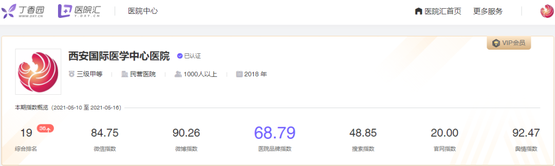 近日,丁香園醫(yī)院匯全國醫(yī)院品牌指數(shù)(5月10日—5月16日)周排行榜發(fā)布,西安國際醫(yī)學(xué)中心醫(yī)院進(jìn)入全國醫(yī)院品牌指數(shù)綜合排名前20強(qiáng),位列第19名。