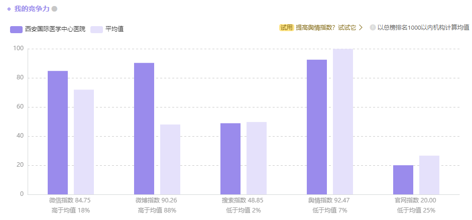 丁香園收錄了全國2000 醫(yī)院的品牌指數(shù),其中包括公立醫(yī)院與非公立醫(yī)院。榜單顯示:西安國際醫(yī)學(xué)中心醫(yī)院綜合排名第19名(較上周上升36個名次);醫(yī)院品牌指數(shù)68.79;微信指數(shù);84.75(高于平均值18%);微博指數(shù)90.26(高于平均值88%);搜索指數(shù)48.85(高于平均值2%);官網(wǎng)指數(shù)20(低于均值25%);輿情指數(shù)92.47(低于均值7%,正面輿情>負(fù)面輿情)。
