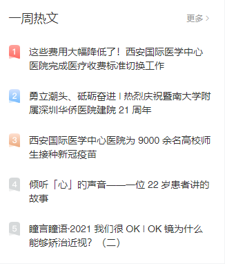 西安國際醫(yī)學(xué)中心醫(yī)院微信公眾號發(fā)布的《這些費(fèi)用大幅降低了!西安國際醫(yī)學(xué)中心醫(yī)院完成醫(yī)療收費(fèi)標(biāo)準(zhǔn)切換工作》《西安國際醫(yī)學(xué)中心醫(yī)院為9000余名高校師生接種新冠疫苗》《傾聽心的聲音——一位22歲患者講的故事》3篇文章入選丁香園丁香號的一周熱文榜單前五名。