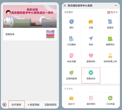 ◆醫(yī)院核酸檢測已開通線上預(yù)約,患者可通過“西安國際醫(yī)學(xué)中心醫(yī)院服務(wù)號”微信公眾號進行預(yù)約。