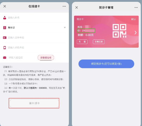 (1)沒(méi)有就診卡的人員,請(qǐng)輸入個(gè)人信息完成就診卡綁定。綁卡后,獲得個(gè)人ID號(hào)。(如圖所示)
