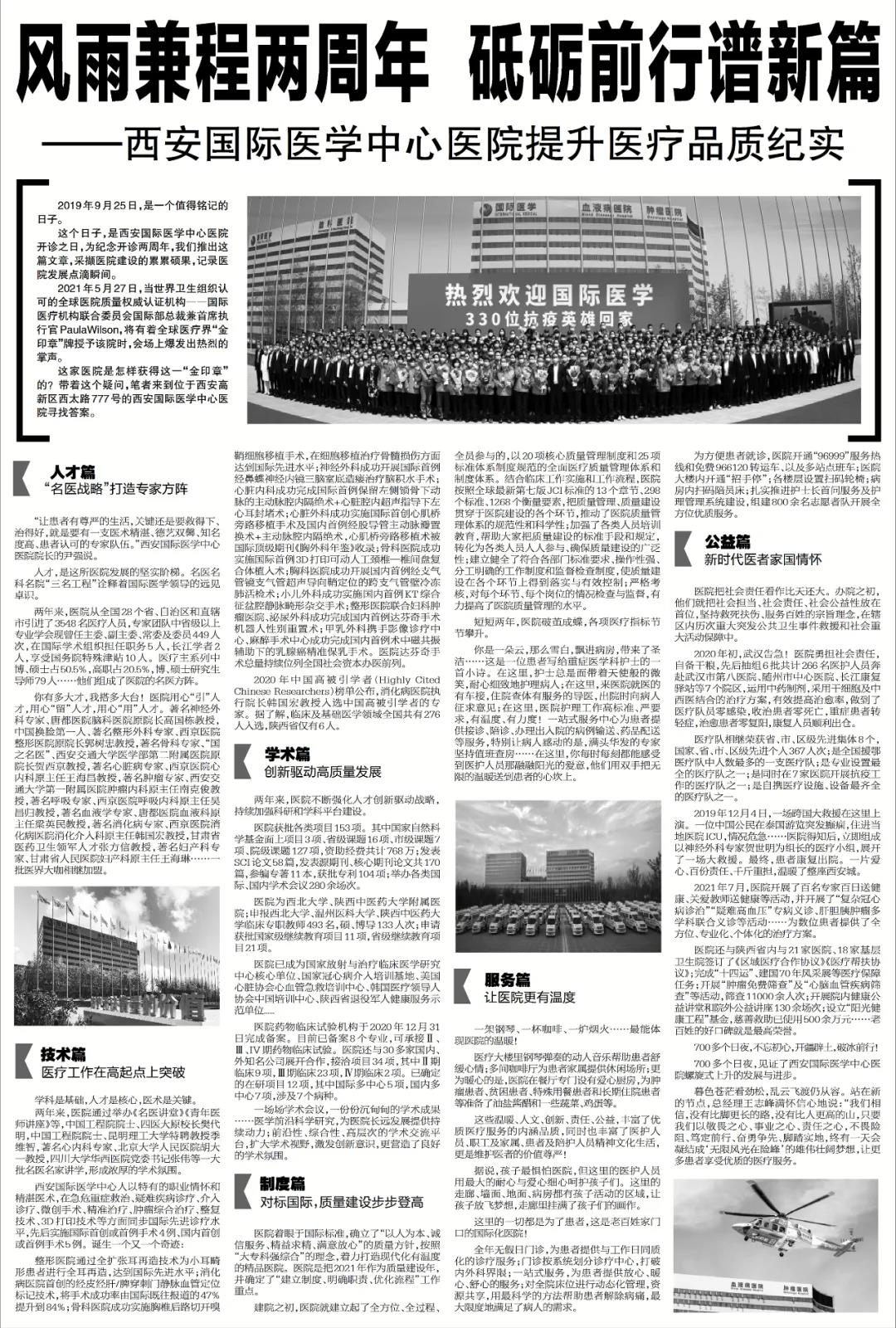 今日《華商報》A8版用整版的篇幅刊登了《風(fēng)雨兼程兩周年 砥礪前行譜新篇——西安國際醫(yī)學(xué)中心醫(yī)院提升醫(yī)療品質(zhì)紀(jì)實》。華商報以圖文并茂的形式記錄了醫(yī)院建設(shè)的點滴瞬間,全方位、多角度報道了醫(yī)院兩年來的發(fā)展碩果。