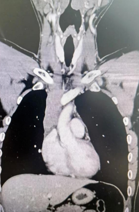 經(jīng)檢查發(fā)現(xiàn)患者前上縱隔腫瘤已經(jīng)完全侵犯了我們?nèi)梭w最主要的大靜脈之一——上腔靜脈,導(dǎo)致上腔靜脈回流嚴重受阻并導(dǎo)致由上腔靜脈起至左側(cè)無名靜脈、右側(cè)鎖骨下靜脈、右側(cè)頸內(nèi)靜脈等多根自上往下回流的靜脈阻塞,從而形成了廣泛的栓子,牢牢堵住了要流回心臟的血流,只能靠別的一些側(cè)支循環(huán)超負荷的工作,這也就是為什么孫先生脖子甚至是頭都明顯腫起來的原因。