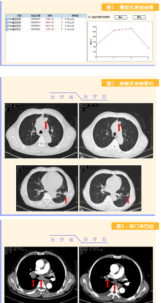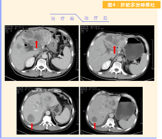 患者完成1周期治療后,上腹部疼痛癥狀基本消失,梗阻性黃疸癥狀緩解,腫瘤指標(biāo)下降(圖1),肺部多發(fā)轉(zhuǎn)移灶消失和縮?。▓D2),雙肺門淋巴結(jié)縮小(圖3),肝臟多發(fā)轉(zhuǎn)移灶縮?。▓D4)。