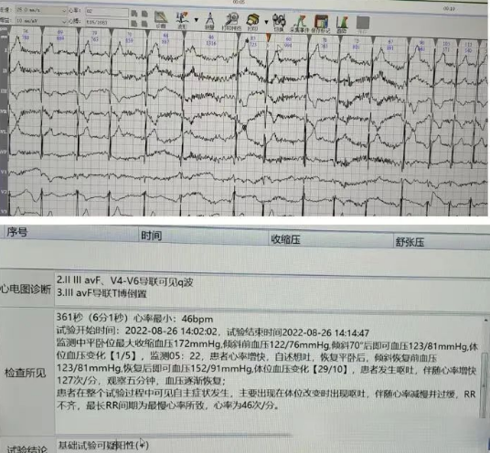 檢查前,心電檢查中心醫(yī)生仔細詢問患者病史,并簽署知情同意書后,進行正式檢查。打開錄播系統(tǒng)及傾斜試驗系統(tǒng),心電檢查中心張錄興主任帶領(lǐng)兩位醫(yī)生進行看護,傾斜前及傾斜后密切觀察患者的心率、血壓和自身狀態(tài)。當傾斜70?后4分鐘患者心率及血壓開始變化,自述頭暈想吐。即可恢復平臥位后測量血壓,患者出現(xiàn)體位變化后發(fā)生嘔吐,伴隨心率由快變慢,并出現(xiàn)明顯竇性心動過緩伴不齊,最慢可達46次/分,嘔吐過后心率逐漸上升90次/分,患者自述暈厥癥狀消失,血壓心率平穩(wěn)后,試驗結(jié)束,診斷暈厥試驗可疑陽性。