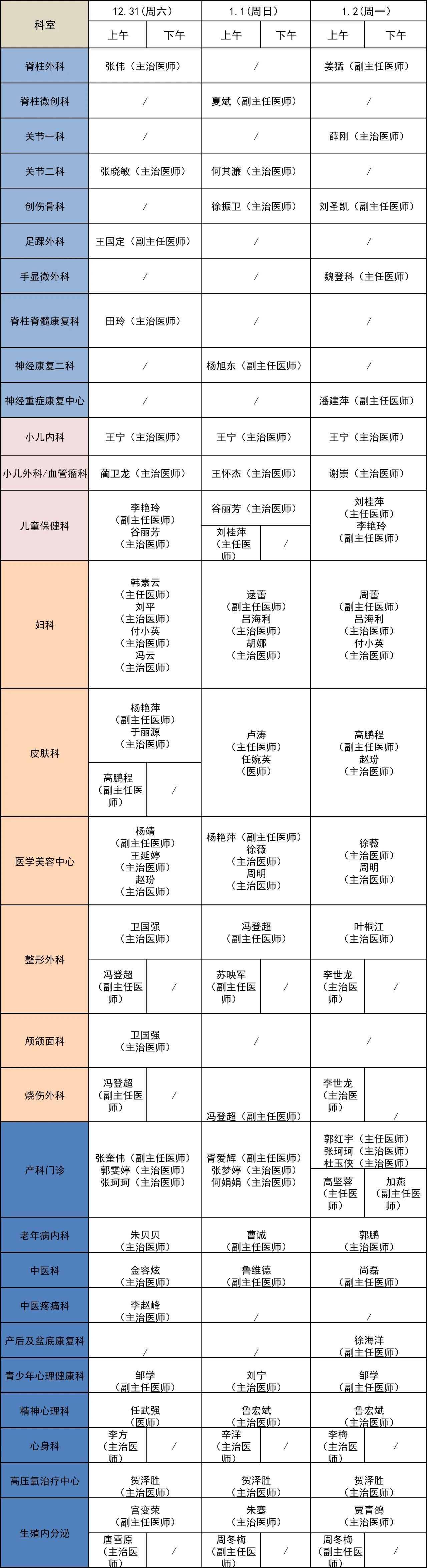 元旦期間門診出診表