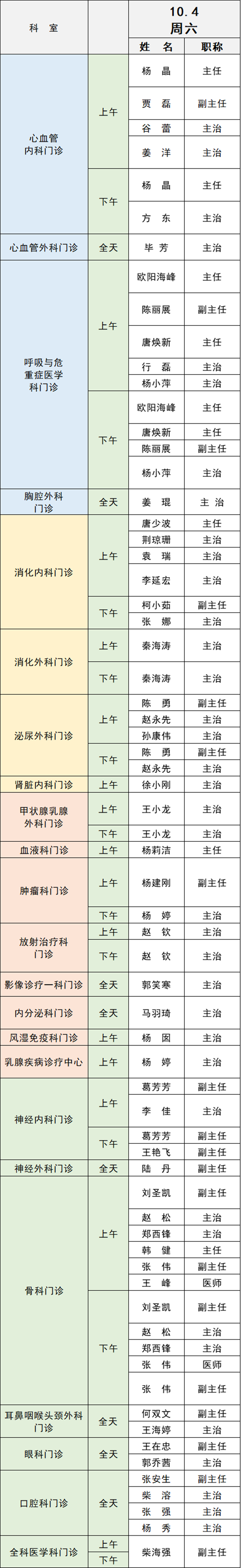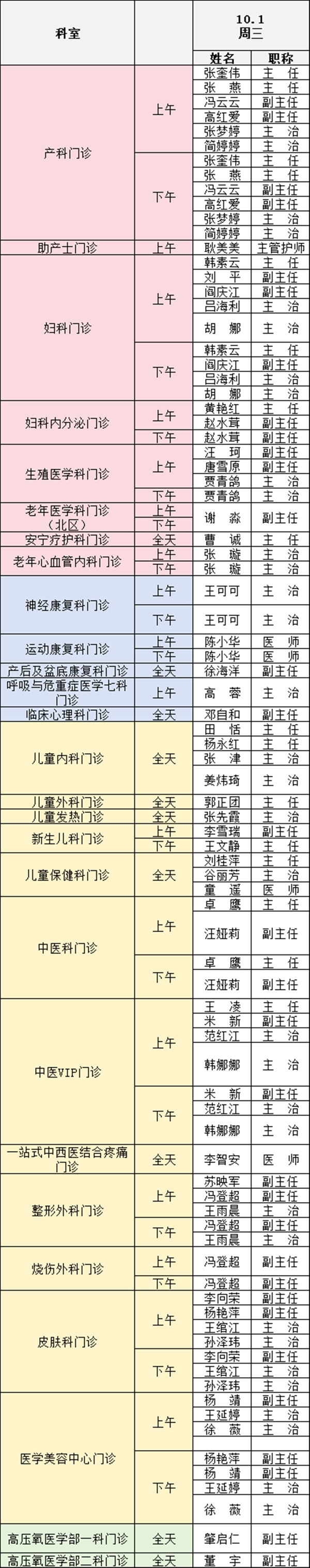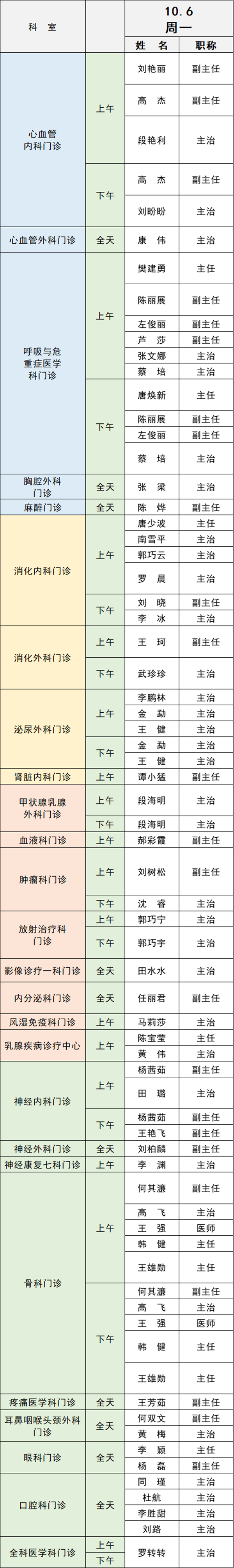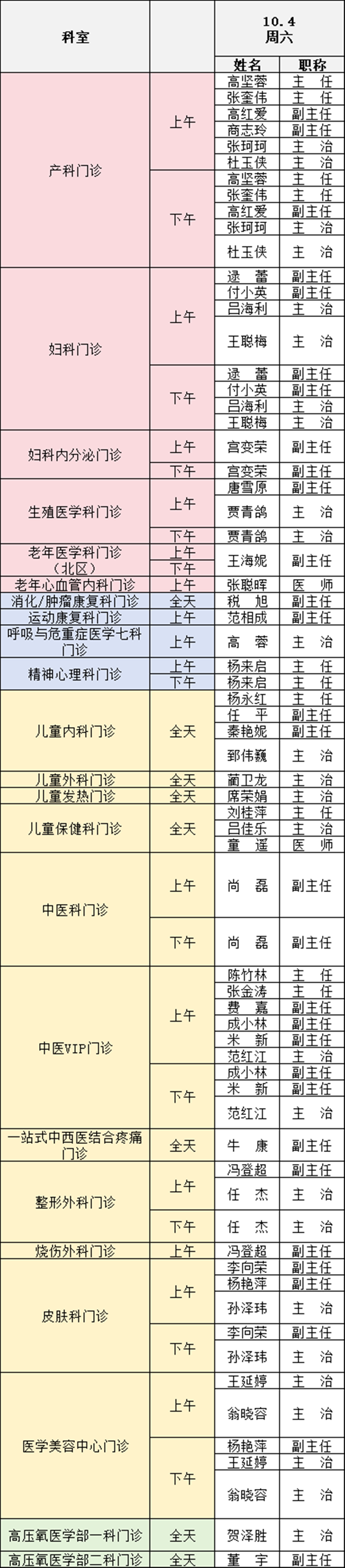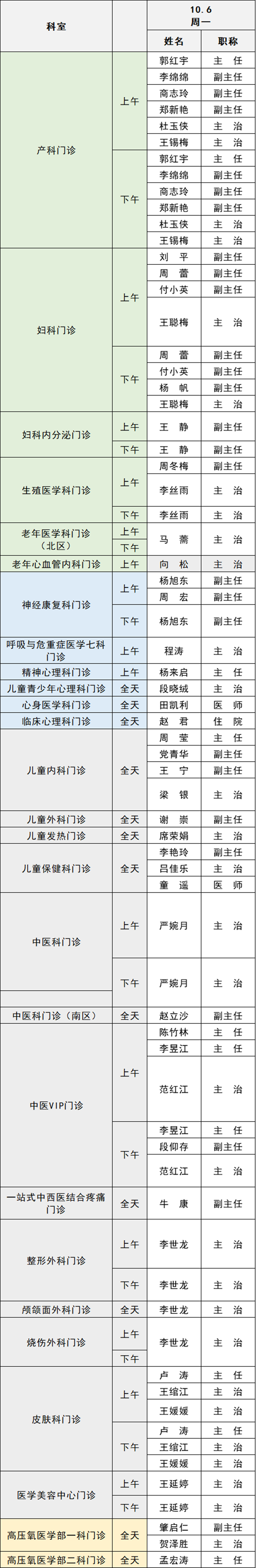 備注:實(shí)際出診情況以醫(yī)院掛號(hào)平臺(tái)實(shí)時(shí)信息為準(zhǔn)。“職稱”欄里主任=主任醫(yī)師副主任=副主任醫(yī)師主治=主治醫(yī)師