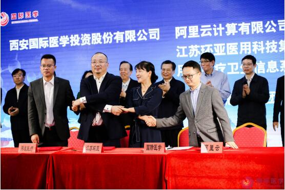 王永康書記等領(lǐng)導和嘉賓們首先參加了西安國際醫(yī)學中心的項目封頂儀式。在打造“ 一帶一路”國際醫(yī)療中心的啟動儀式上,國際醫(yī)學董事長史今代表公司與西安電子科技大學校長楊宗凱、英國國王學院代表簽訂《共建國際醫(yī)學院合作框架協(xié)議》;與阿里云簽訂《落地實施協(xié)議》、與江蘇環(huán)亞簽訂《信息化合作協(xié)議》、與用友醫(yī)療簽訂《信息化集團管控項目實施協(xié)議》。